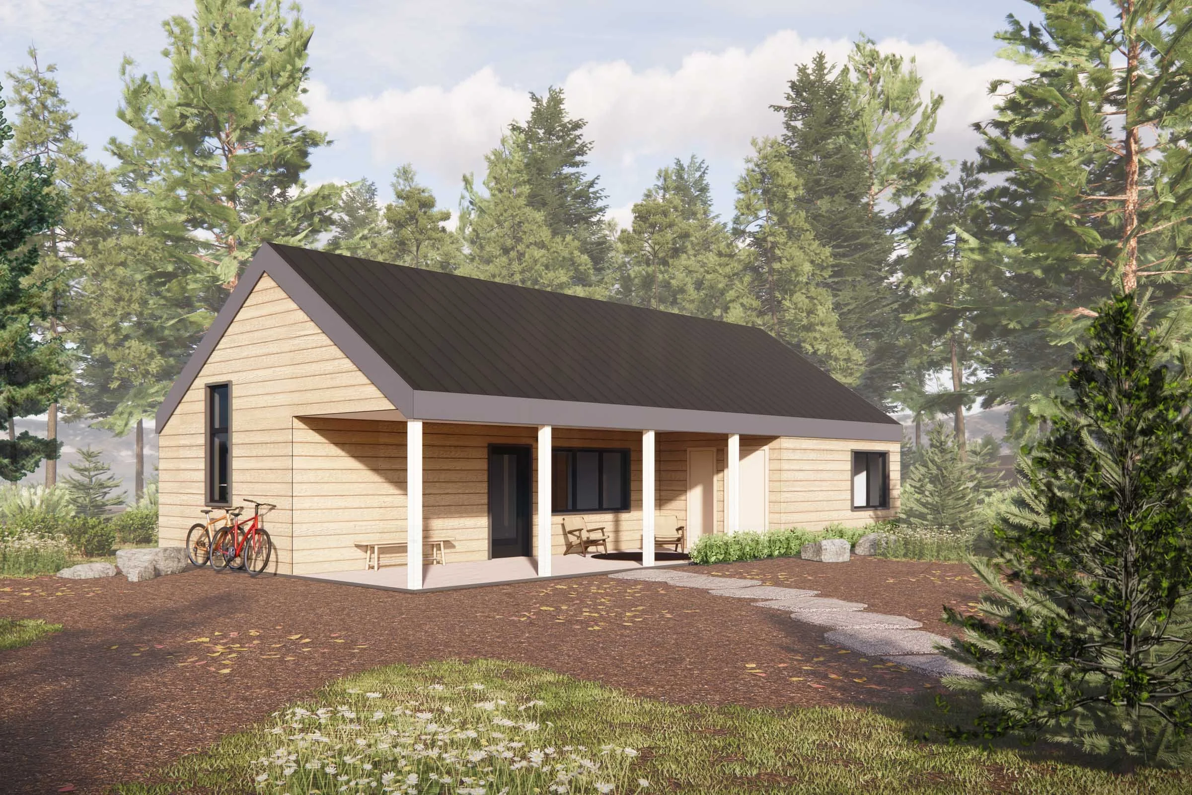 Plumas County approached Workbench to develop ADU designs along with plans and materials guides, building documents, and educational resources to assist owners in creating new housing as well as replacing housing. The Plumas County Predesigned ADUs prioritize flexibility for use in the most sites possible, as well as fire safety. Firewise design strategies from the very onset, including roof forms, simple shapes, and materials, the project aims to reduce the chances of structure fires and promote community safety. Workbench flexible design strategy developed 4 floor plan options, with 4 exterior styles including a one-bedroom, suitable as a starter home, a large one-bedroom, ideal for couples and aging in place, a two-bedroom, aimed at roommate and young family needs, and a three-bedroom two-story floor plans that offer versatility and even primary residence size.